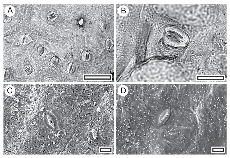 Figure 17. CUT-L-FJA; (A) TLM view of stomatal complexes, SL2125, scale: 50µm; (B) TLM of stomatal complex. Note distinct scales, SL2125, scale: 20µm; (C) Inner SEM view of stomatal complex. Note granular surface, S-1405, scale: 10µm; (D) Outer SEM view of a stomatal complex. The outline is subdued and the rest of the surface almost featureless, S-1405, scale: 10µm.