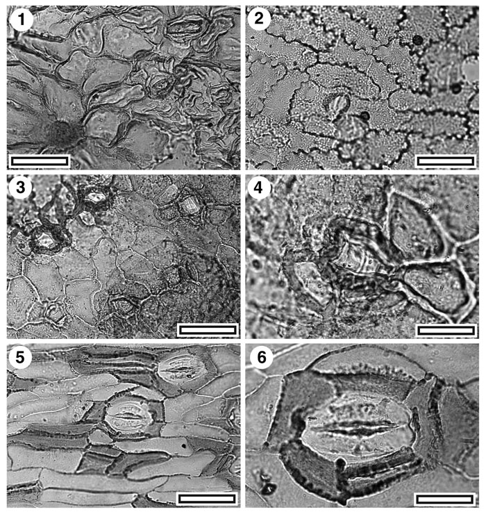Figure 4. Pterostoma sp. and Bowenia sp. 1. Pterostoma hirsurtus. TLM view showing stomata at right, surrounded by prominent ridges of cuticle, and, lower left, a trichome base (SL5381, scale-bar = 50 µm); 2. ?Pterostoma. TLM view showing a single stomatal complex (SB0384, scale-bar = 50 µm); 3. ?Pterostoma. TLM view showing five stomatal complexes (SB0690, scale-bar = 50 µm); 4. ?Pterostoma. TLM detail of a single stomatal complex. Note massively thickened ring around stomatal pore (SB0690, scale-bar = 20 µm); 5. Bowenia. TLM view showing two stomatal complexes. Note differently thickened peristomatal walls of epidermal and subsidiary cells (SL5059, scale-bar = 50 µm); 6. CUT-Z-ACB. TLM detail of a single stomatal complex (SL5335, scale-bar = 20 µm).