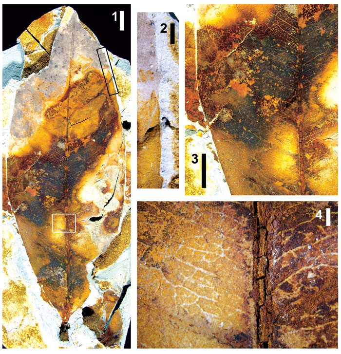 Figure 6. Rhabdophyllites diapyros, holotype, USNM 535054. (1) Complete specimen, showing closely spaced, thin, numerous secondaries and intersecondaries ("Clusia" venation) and small teeth developed towards apex. Sscale bar equals 1 cm (petiole not recovered, apparent petiolar area is a hole in the thin matrix), with insets from top to bottom for (2) detail of apical margin with small teeth. Scale bar equals 1 mm, (3) close-up of left margin showing secondary, intersecondary, and tertiary venation, scale bar equals 1 cm, and (4) detail of venation diverging from midvein, showing closely spaced secondary and intersecondary veins as well as reticulate tertiary veins. Scale bar equals 1 mm.