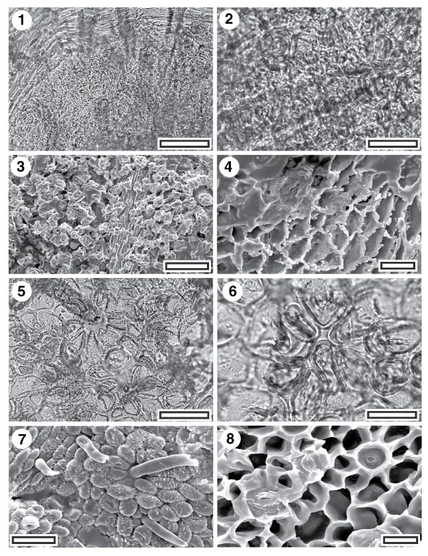 Figure 38. 1-8. Papillate Cuticle: CUT-Z-ABI and CUT-Z-ECH. 1. CUT-Z-ABI, TLM view showing stomatal complexes entirely obscured by papillae and trichomes (SB1299, scale-bar = 50 µm); 2. CUT-Z-ABI, TLM detail showing papillae (SB1299, scale-bar = 20 µm); 3. CUT-Z-ABI, SEM view of outer cuticular surface showing papillae obscuring stomata (S-1217, scale-bar = 20 µm); 4. CUT-Z-ABI, SEM of inner cuticular surface showing stomatal complex (upper left) (S-1217, scale-bar = 20 µm); 5. CUT-Z-ECH, TLM view showing trichomes, papillae, and obscured stomatal complexes (SB1208, scale-bar = 50 µm); 6. CUT-Z-ECH, TLM view showing a single stomatal complex with papillae overarching the stomatal pore (SL1208, scale-bar = 20 µm); 7. CUT-Z-ECH, SEM view of outer cuticular surface showing papillae and trichomes (S-1209, scale-bar = 20 µm); 8. CUT-Z-ECH, SEM view of inner cuticular surface showing (left) a single stomatal complex and (right) a trichome attachment scar (S-1209, scale-bar = 20 µm).