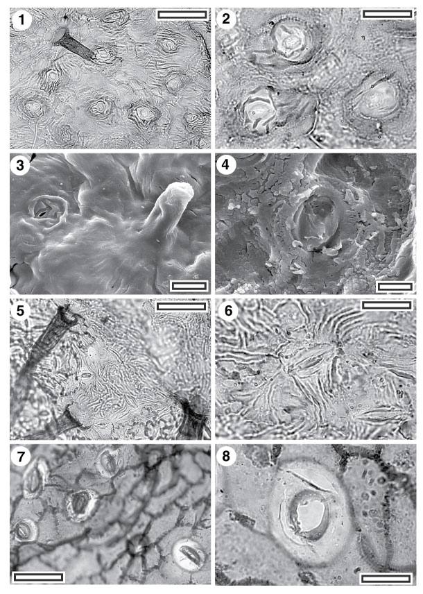 Figure 44. 1-8. Cuticle with persistent trichomes: CUT-Z-CDC, CUT-Z-FFE, and CUT-Z-EEJ. 1. CUT-Z-CDC, TLM view showing stomatal complexes and a trichome (SL0332, scale-bar = 50 µm); 2. CUT-Z-CDC, TLM detail of three stomatal complexes (SL0332, scale-bar = 20 µm); 3. CUT-Z-CDC, SEM view of outer cuticular surface showing a stomatal complex (left) partially obscured by ridges of cutin, and a broken trichome (right) (S-1104, scale-bar = 20 µm); 4. CUT-Z-CDC, SEM view of inner cuticular surface showing a single stomatal complex. Note very granular texture (S-1104, scale-bar = 10 µm); 5. CUT-Z-FFE, TLM view showing stomatal complexes and trichomes (SL2120, scale-bar = 50 µm); 6. CUT-Z-FFE, TLM detail of two stomatal complexes (SL2120, scale-bar = 20 µm); 7. CUT-Z-EEJ, TLM view showing stomatal complexes and broken trichomes (SL1778, scale-bar = 50 µm); 8. CUT-Z-EEJ, TLM detail of single stomatal complex (SL1778, scale-bar = 20 µm).