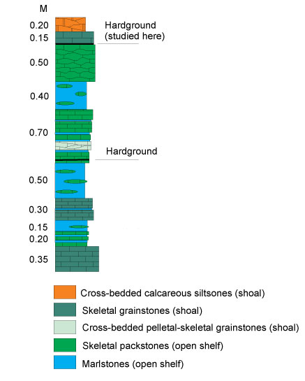 FIGURE 2. Geological section of the Ohesaare cliff (modified after Nestor 1990). Location of the studied hardground in the section.